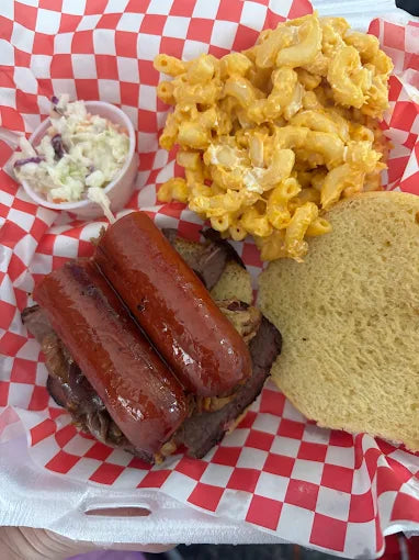 Chopped brisket, pulled pork and sausage with coleslaw served with a small side